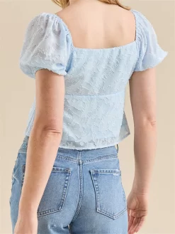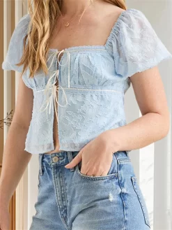 Women Summer Blouses Short Puff Sleeve Front Tie-up Crop Shirts Jacquard Lace Tops Casual Loose